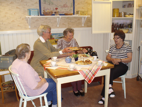 Här sitter Elna Jansson, Birgit Carlsson från Studieförbundet Vuxenskolan (iklädd lottauniform) samt Anna-Stina Karlsson och Gunilla Jansson i "Min Soldat"-köket på kaptensgården i Säffle den 23 maj 2012. Det var kaffekalas i köket då det bjöds på småkakor, klengås och kalvdans.