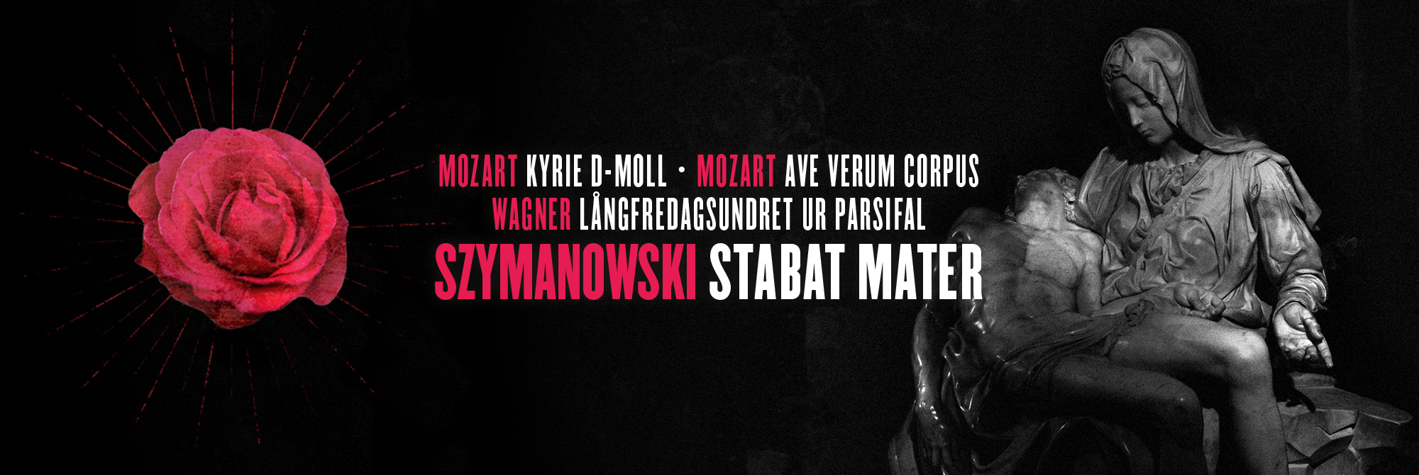 Mozarts körverk Kyrie och Ave Verum Corpus inleder den timmeslånga konserten vilken följs av Wagners orkestrala Långfredagsundret ur Parsifal.